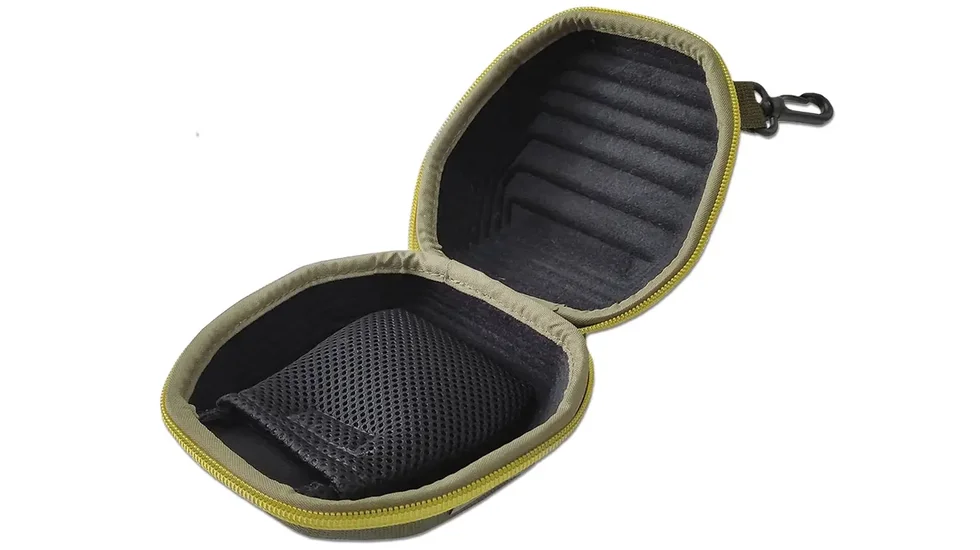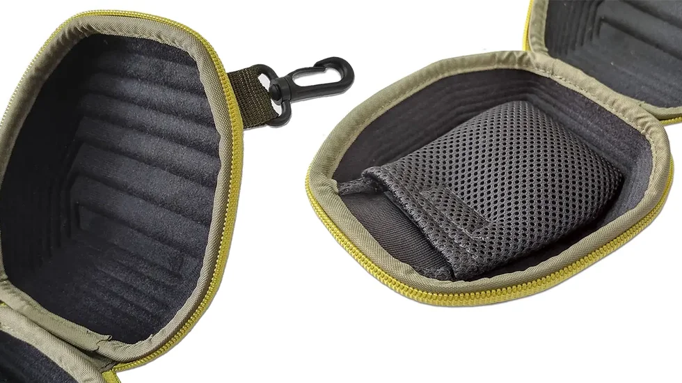 Внутрішня кишенька з тришарової сітки дозволяє зручно зберігати знімну ручку котушки. Для зручності носіння на зовнішній стороні чохла є карабін, за допомогою якого ви можете прикріпити чохол до шлюфки штанів або сумки. Компактний розмір дозволяє помістити чохол навіть у рюкзак чи сумку.