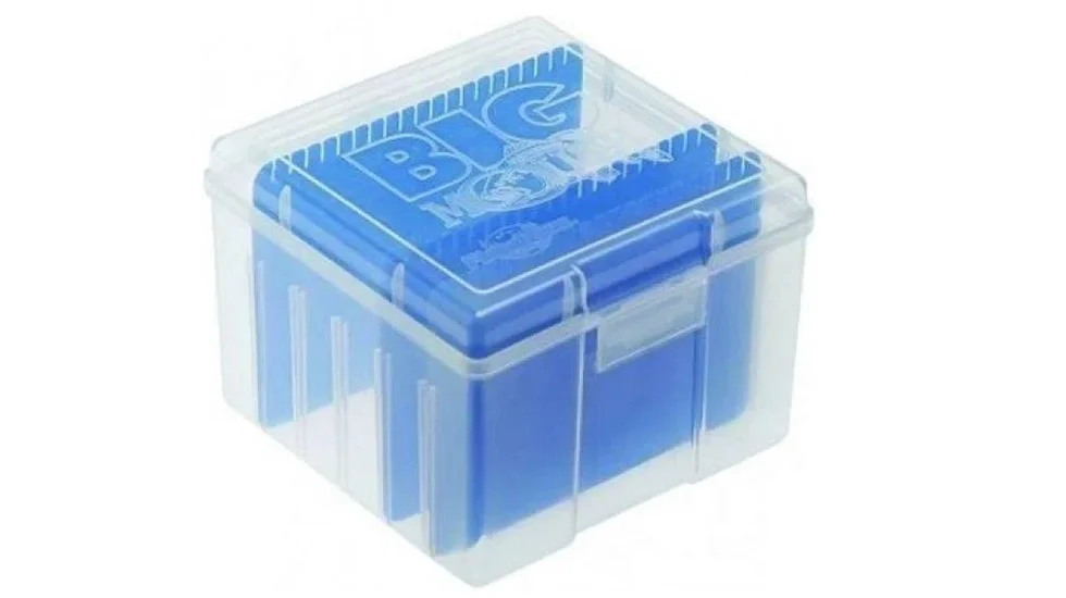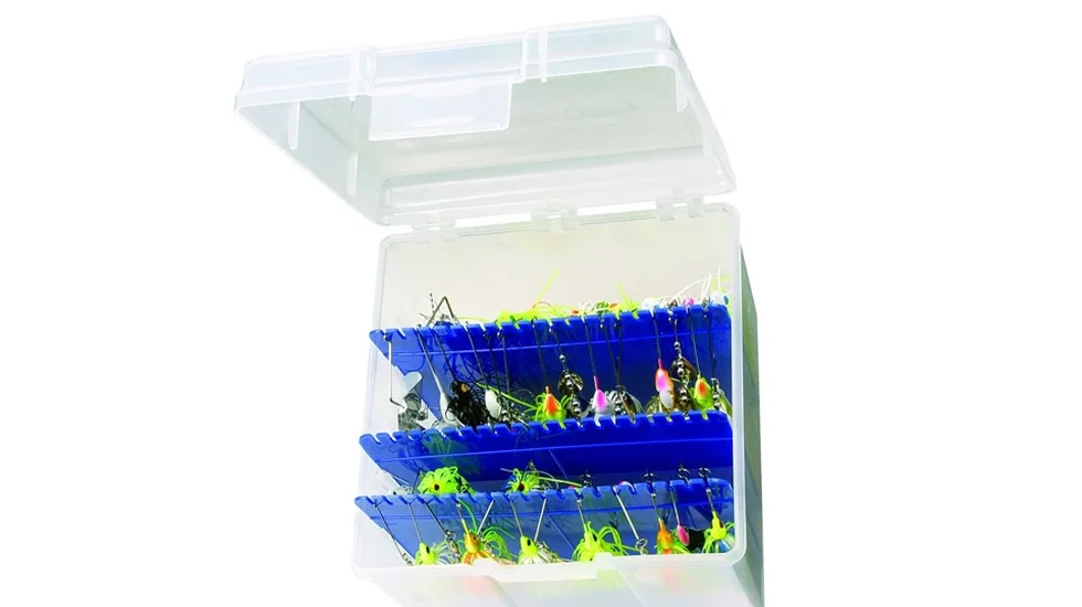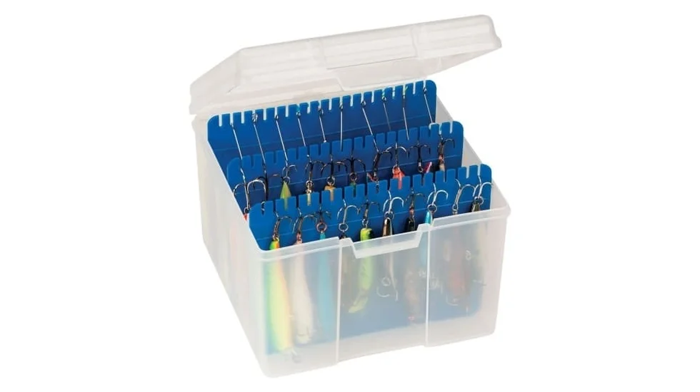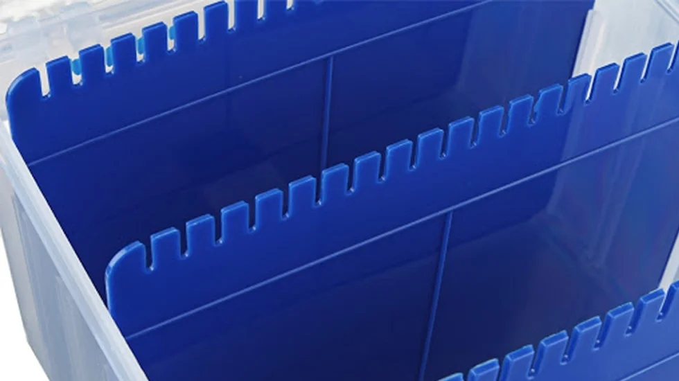 Містка коробка для зберігання спінербейтів. Виготовлена з прозорого пластика з внутрішньою обробкою полімером Zerust, який не дозволяє утворюватися корозії на металевих елементах. Є можливість перевстановлення перегородок.