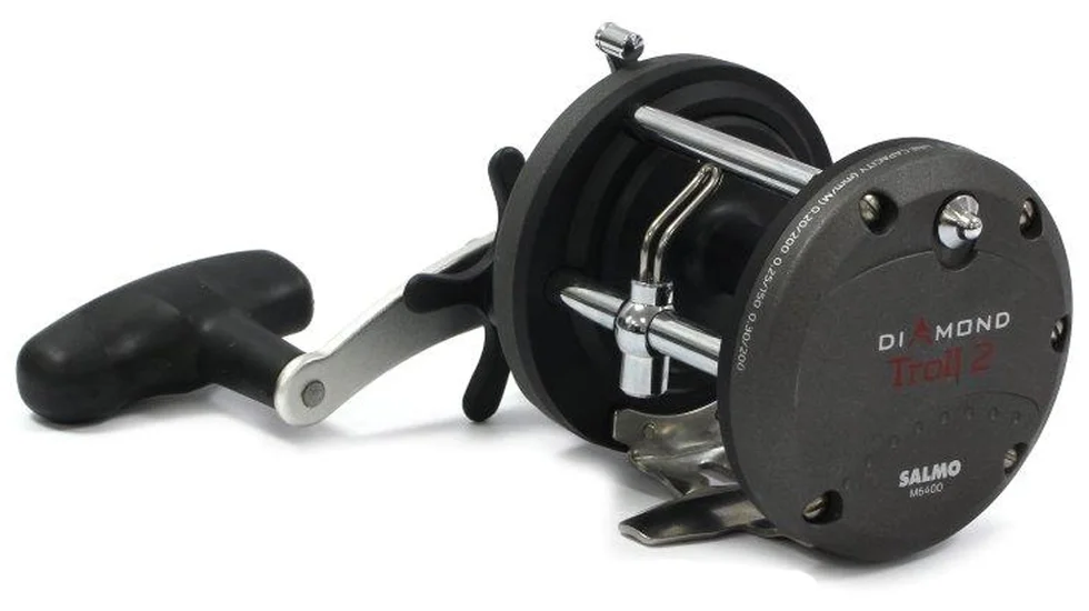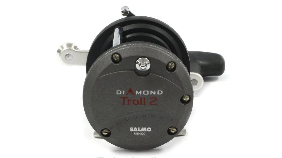 Котушка Salmo Diamond Troll призначена для лову тролінгом, прямовиснії морськії риболовлі, а також трофейної рибалки з попереднім завезенням оснастки в точку лову. Механізм мультиплікатора має неймовірний запас міцності і високу потужність, які дозволяють використовувати котушку для боротьби з дійсно великою рибою, не побоюючись за цілісність виробу під великими навантаженнями. Рівномірне укладання волосіні здійснюється дротовим укладачем, що рухаються по нескінченному гвинту. Одинарна алюмінієва рукоять розташовується праворуч і оснащується великим ергономічним кнобом для силового захвату. Котушка Salmo Diamond Troll 2 оснащується карбопластовою шпулею. На валу шпулі встановлені два кулькових підшипника підвищеної міцності з нержавіючої сталі. Механізм владача волосіні залишається в роботі незалежно від режиму перемикача - вільний хід/включена передача. Стопор зворотного ходу механічний з храповиком-тріскачкою.