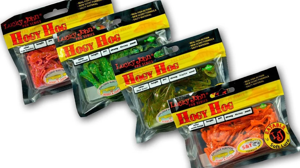 Їстівна гума Lucky John Hogy Hog - це приманка своєрідна за формою, нагадує одночасно і велику личинку комахи, і рачка. У неї маленьке тіло, два щупальця, кілька пар ніжок і дві масивні клешні ззаду. Hogy Hog має чіткий смак і запах раку. Вибір кольорів, як і у всіх принад Lucky John, радує своїм різноманіттям. Для лову окуня, наприклад, відмінно підійдуть: PA16 (Cola), PA03 (Green Pumpkin), PA17 (Mr. Brown). Є також кольори для лову форелі: 052 (Pink Troutino), 031 (Bubblegum). Їстівна гума Hogy Hog відмінно підходить для мікроджигового лову з активною анімацією вудилищем, тобто з різними ривками і волочінням по дну. Саме при такому варіанті проводки може бути досягнуто найприроднішу поведінку приманки, і вона стає схожа на комашку, що копошиться на дні. Хороших результатів можна домогтися, використовуючи Hogy Hog на каролінському або техаському оснащеннях.
