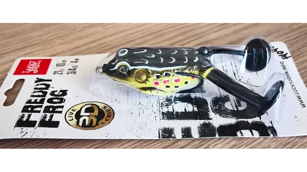 FREDDY FROG - м'ягкі приманки, які імітують жаб, рибалки використовують для лову на поверхні серед водної рослинності. Спіймати на таку приманку можна як велику щуку, так і більш екзотичну здобич - змієголова. Тіло «жаби» від фірми Lucky John виконано з м'якого силікону. При клюванні порожнистий м'який корпус легко продавлюється під могутніми щелепами хижака, оголюючи жала подвійного гачка. До речі, саме завдяки тому, що вістря звернене вгору, «жаба» без зусиль проходить зарослі ділянки водойми. Лапки створюють на поверхні водойми таку гру, яка приверне увагу великого хижака, який бажає поласувати таким ситним «обідом», як жаба. Вага модифікації становить 21 гр., а її довжина – 6,4 см.