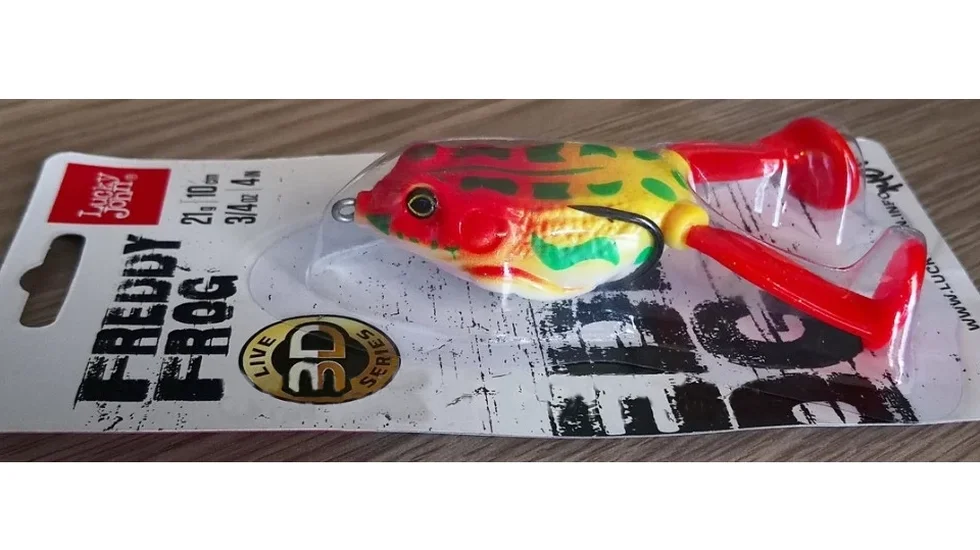 FREDDY FROG  - м'ягкі приманки, які імітують жаб, рибалки використовують для лову на поверхні серед водної рослинності. Спіймати на таку приманку можна як велику щуку, так і більш екзотичну здобич - змієголова. Тіло «жаби» від фірми Lucky John виконано з м'якого силікону. При клюванні порожнистий м'який корпус легко продавлюється під могутніми щелепами хижака, оголюючи жала подвійного гачка. До речі, саме завдяки тому, що вістря звернене вгору, «жаба» без зусиль проходить зарослі ділянки водойми. Лапки створюють на поверхні водойми таку гру, яка приверне увагу великого хижака, який бажає поласувати таким ситним «обідом», як жаба. Вага модифікації становить 21 гр., а її довжина – 6,4 см.
