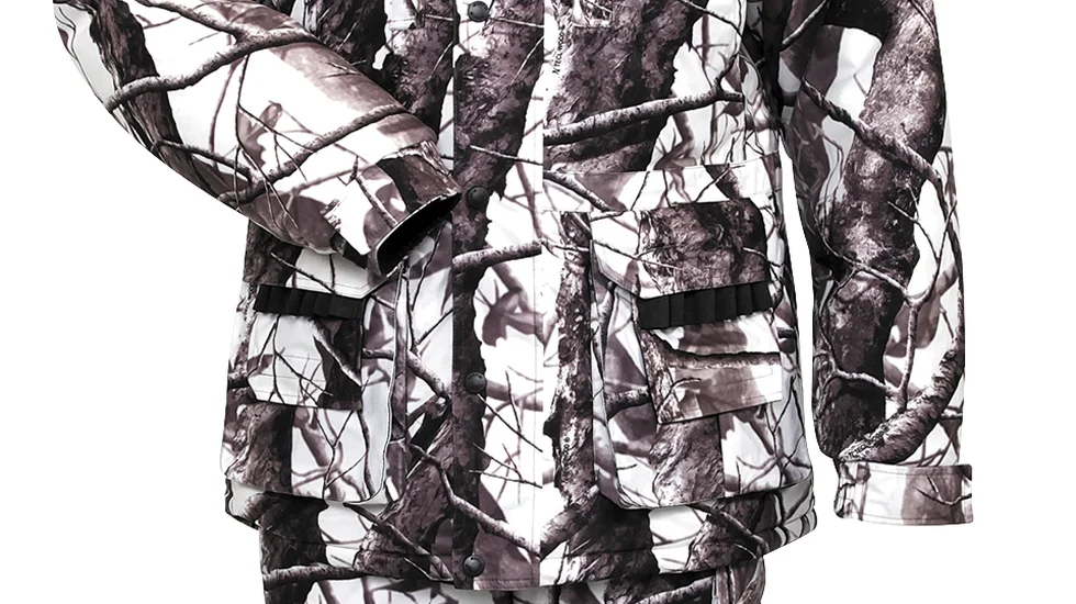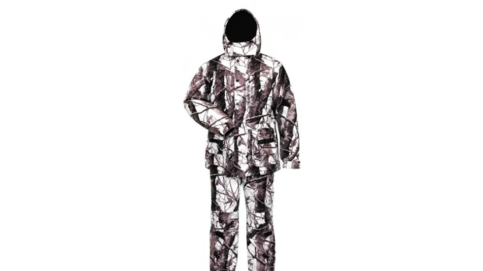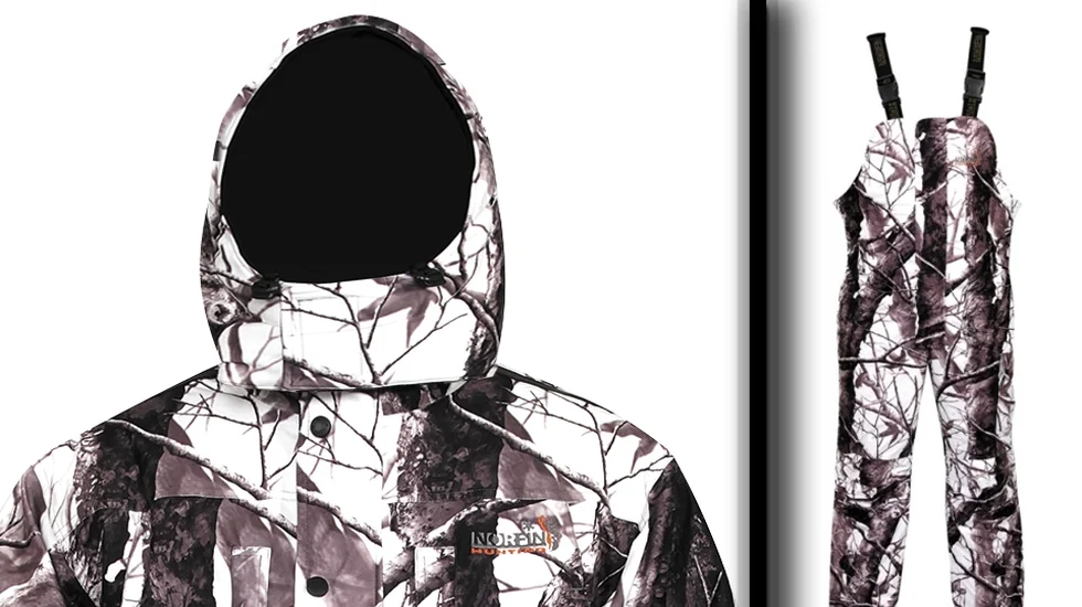 Мисливський костюм з матеріалу, що не шарудить виготовлений за технологією North Silent Material. Костюм призначений для експлуатації при температурі до -30 ° С. У верхній частині кожної кишені є інтегровані патронташі. Для зручності мисливця, плечі куртки посилені протиковзкими накладками. Проклеєні шви. Мембранна тканина. Камуфльоване забарвлення. Матеріал Nortex Breathable (80% поліестер, 20% PU мембрана), утеплювач Hollofil (100% поліестер). Водонепроникність 6000 мм, "дихаюча" здатність матеріалу 6000 г / м² / 24г.