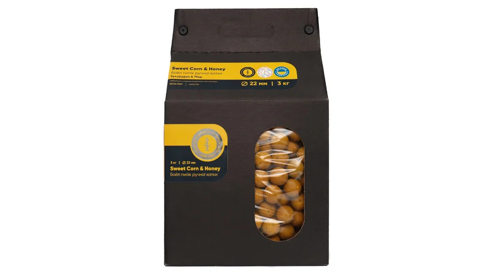 Бойли пиліки – "Кукурудза / Мед", 22мм – 3кг від IRON FISH –  виготовлені на основі преміум міксу, який включає збалансований вміст білків, жирів та вуглеводів, ці бойли є ідеальними для риболовлі на коропа, амура та інших видів риб. Скатані вручну на англійських дошках. Поєднання аромату кукурудзи та меду робить їх надзвичайно привабливими для риби, підвищуючи шанси на успішний улов.
