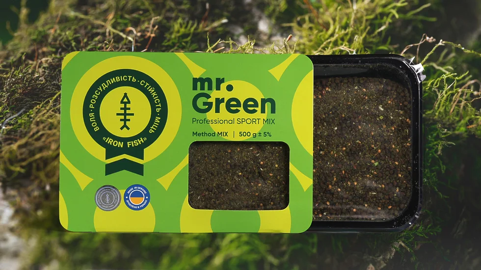 Метод Мікс - "mr. Green" Professional SPORT MIX від ТМ IRON FISH - надскладний, багатокомпонентний мікс із насиченим рибним смаком. Розроблений для професійних спортсменів рибалок. У складі 24 компоненти, а для зберігання використовуються натуральні консерванти як Гімалайська сіль та Вітамін Е. Зелений колір та додаткову харчову привабливіть забезпечує високоякісна рибна мука, суміш протеїнів та спіруліна. Привада для використання як в теплій так і в холодній воді. БЕЗ АРОМАТИЗАТОРІВ ТА ШТУЧНИХ КОНСЕРВАНТІВ!