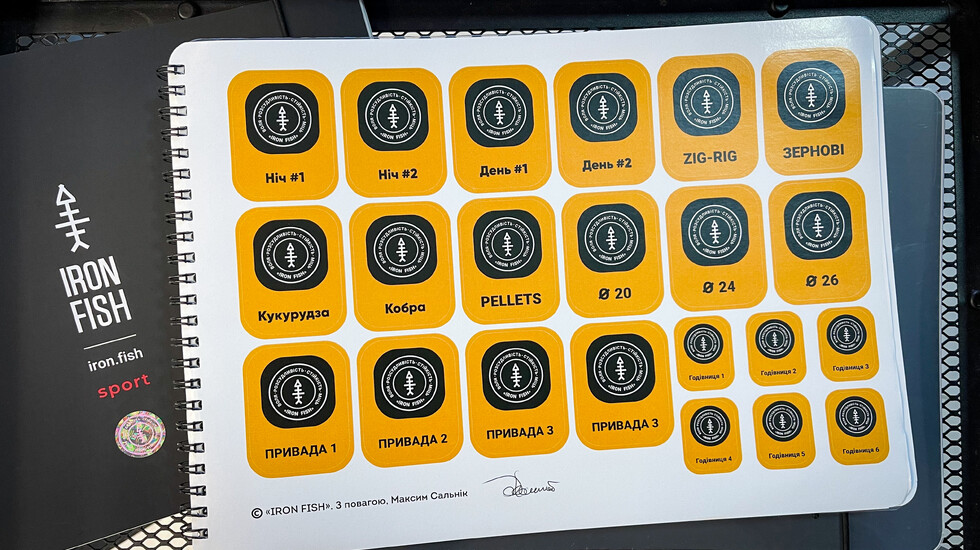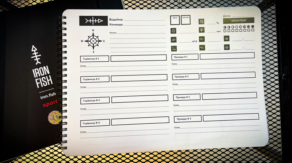 Риболовний щоденник для нотатків "IRON FISH" - містить 65 сторінок, із них під записи 45 сторінок та 20 під маркування сектору. Також, у наборі сторінка з НАЛІПКАМИ - для маркування ведер та тари під замішування привади. Аналізуй кожну риболовну сесію, роби висновки, стань думаючим рибалкою та переможцем!