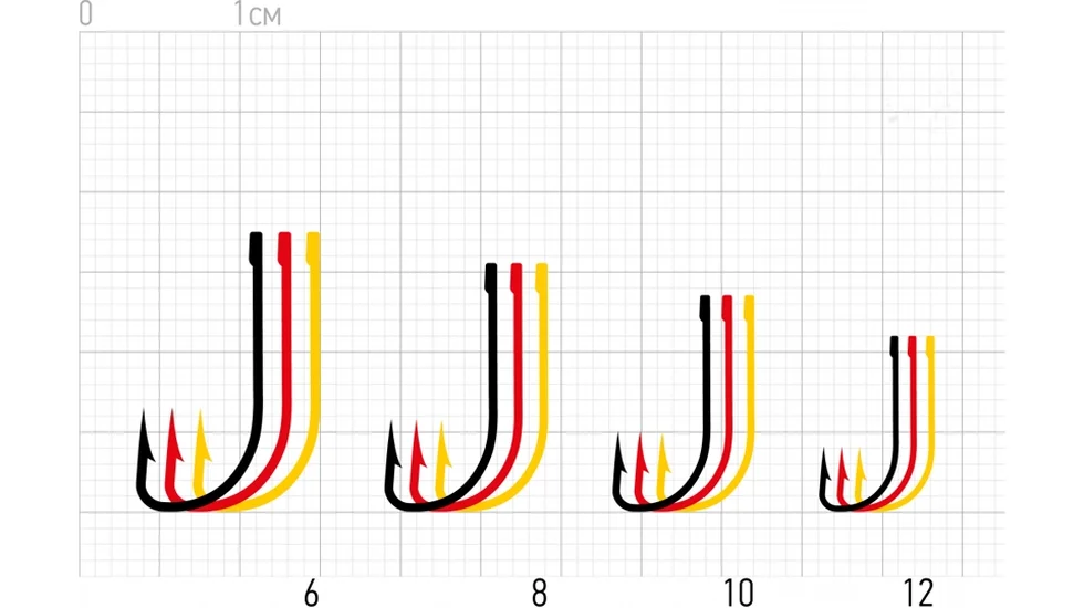 Гачки класичної форми з прямим загином цівки. Комплектуються за принципом «три в одному». В упаковці розфасовані гачки з трьома різними за кольором покриттями: B, R і G, що дозволяє зробити гачки в оснащеннях менш помітними для риби.