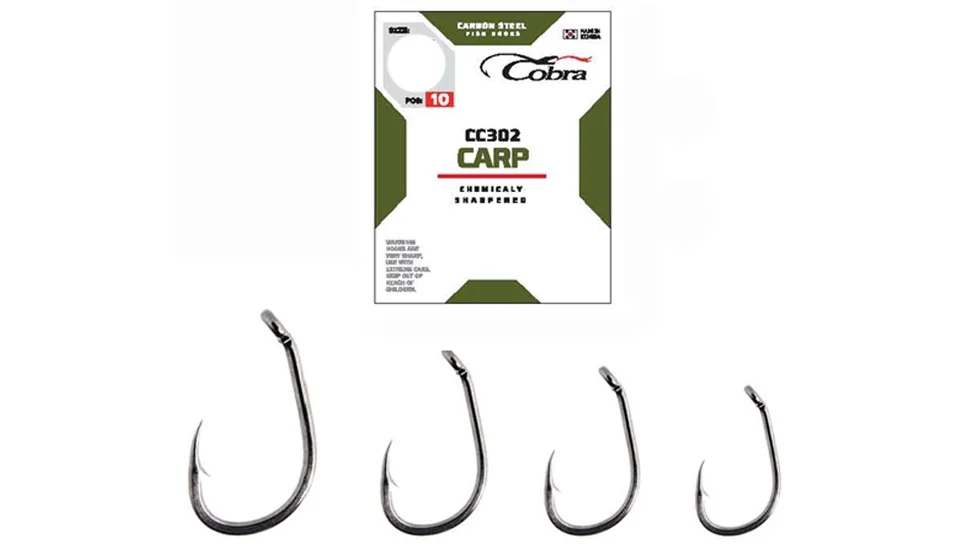 При полюванні на вибагливого коропа має значення кожна дрібниця. Винятком не є і гачок: він контактує з рибою безпосередньо. Експерти бренду Кобра створили лінійку Carp CC302 спеціально для цього виду лову. Вона виготовлена з міцної високовуглецевої сталі. Має хімічну заточку, яка забезпечує високу проникаючу здатність. Модель Cobra Carp CC302 отримала трохи вкорочену ніжку, загнуте до жала кріпильне кільце, широкий підчеп. Геометрія даного гачка продумана для успішної підсічки навіть при дуже боязких невпевнених клюваннях. Борідка допоможе утримати трофей. Підходять одинарники як для використання з насадками, так і для волосяних монтажів.