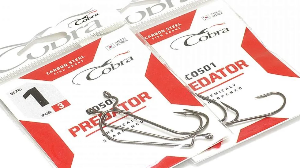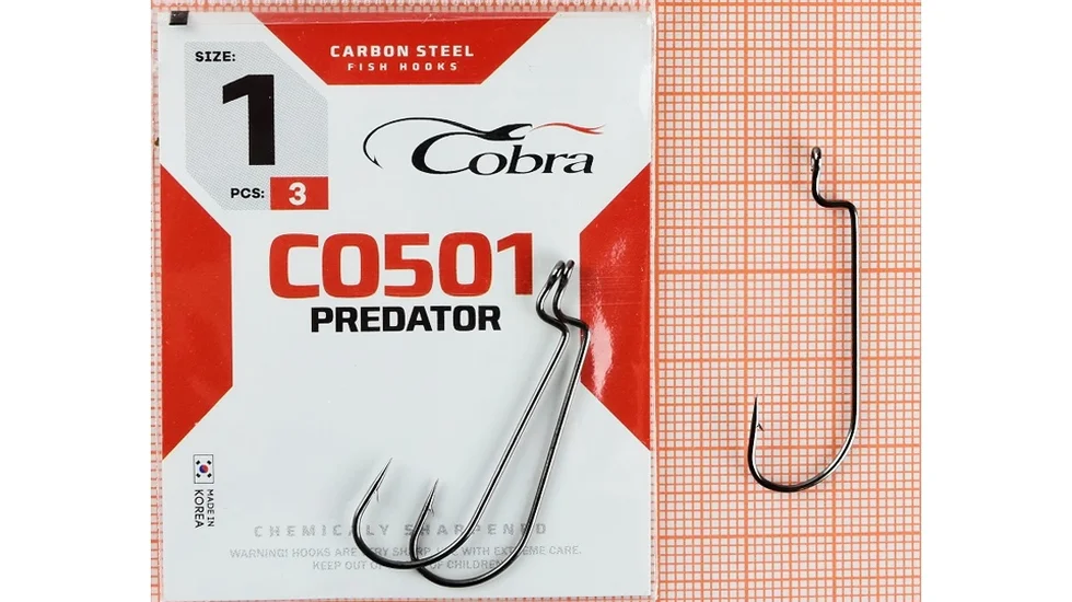 Назва бренду Cobra відображає безкомпромісність цих гачків. Як і смертоносна змія, ці гачки не залишать шансів своїй здобичі. Лінійка Predator включає в себе кілька модифікацій. Тут представлені офсетніки, позначені індексом CO501. Виконані вони з міцного сталевого дроту. Пряме жало з найгострішим заточуванням істотно підвищує шанси риболова на успішну підсічку. Борідка під час виведення не дає хижакові зійти. Підчеп округлий. Ніжка подовжена, на ній можна надійно зафіксувати довготілу силіконову приманку. У верхній частині - характерна для гачків цієї категорії сходинка. Кріплення до оснащення здійснюється за допомогою невеликого вушка.