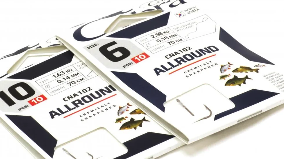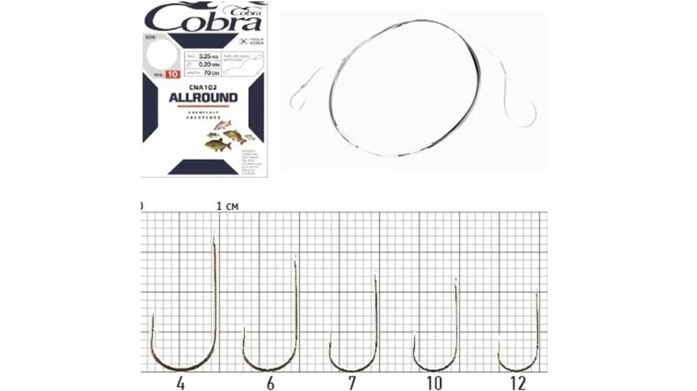 Для того, щоб спростити монтаж і прискорити час підготовки до риболовлі, зручно використовувати лінійку з індексом CNA102. Ці одинарники вже оснащені повідцем в розмотуванні 70 см. Діаметр волосіні і її розривне навантаження відповідають номеру гачка. Розрахована серія в першу чергу на полювання мирної риби за допомогою поплавкової снасті. Одинарники з широким підчепом виготовлені з міцної високовуглецевої сталі. Жало має хімічну заточку для кращої проникаючої здатності. Борідка забезпечує надійне утримання клюнувшої риби. Для кріплення до повідця у одинарників Cobra Allround CNA102 передбачена лопатка.