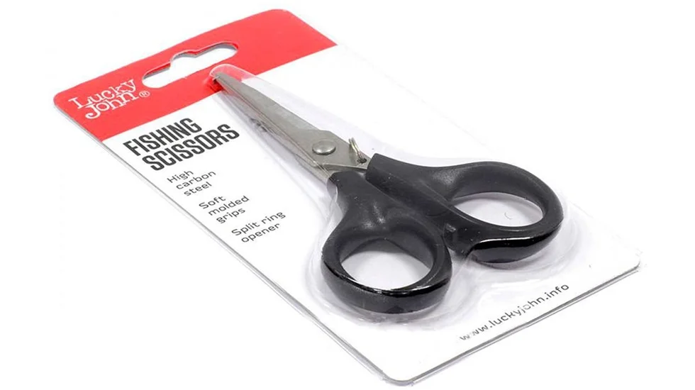 Ножиці Lucky John 03 призначені для розрізання плетеної лінії завдяки зубчастій поверхні лез. Вони також оснащені спеціальним пристосуванням для розжимання заводних колець.
