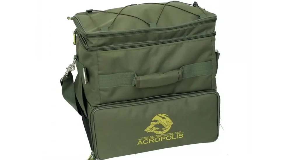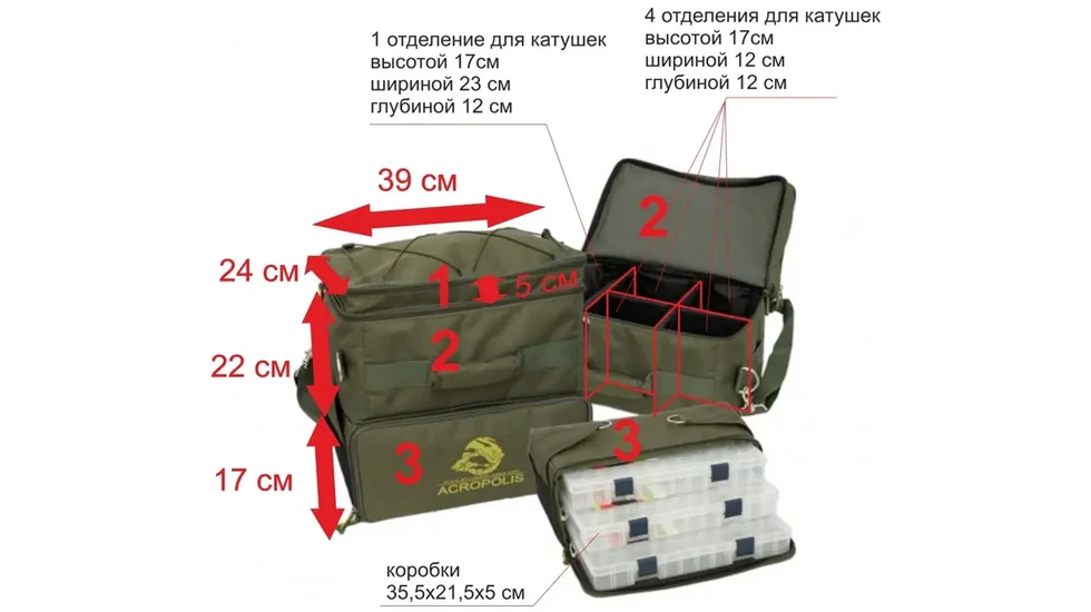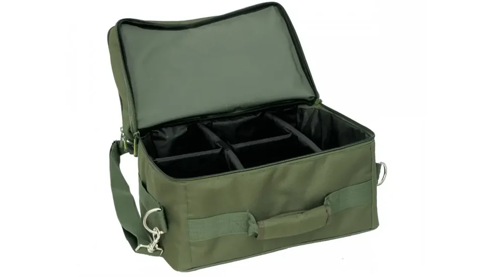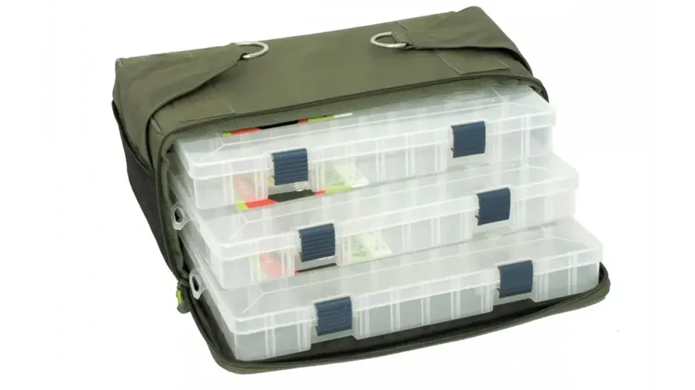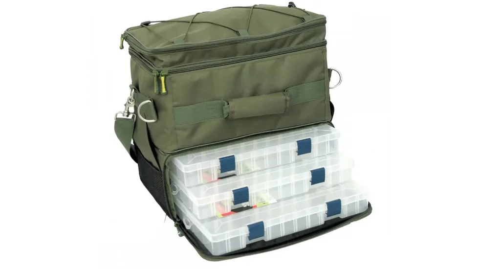 Нижня частина сумки комплектується трьома великими прозорими коробками для снастей, знімними перегородками для регулювання розміру відсіків під воблери, джерки, силіконові приманки тощо. Коробки можна легко витягти, перетворивши сумку на універсальну для інших цілей. Металеві карабіни на боках забезпечують зручність перенесення сумки на плечі.