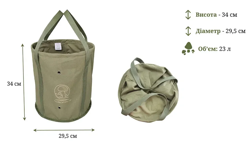 Відро ВГ-1 виготовлене з водовідштовхуючого брезенту, що забезпечує довговічність та зручність у використанні.
