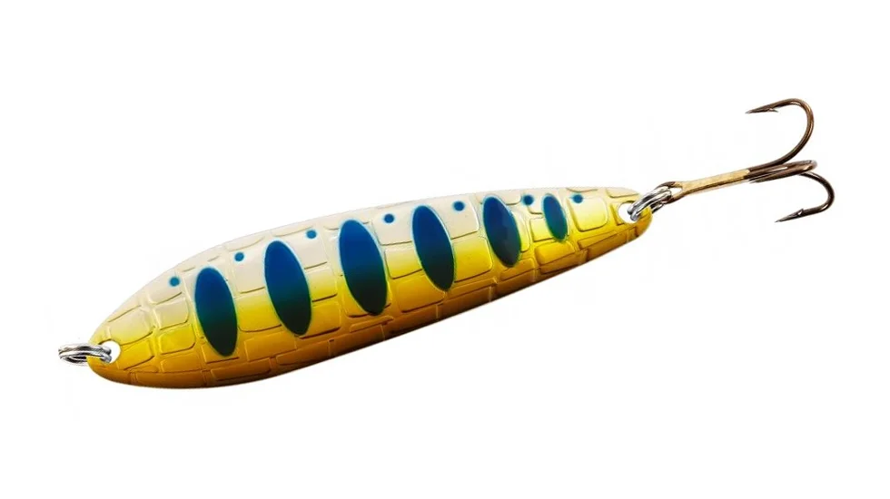 Блешні серії Croco Spoon Big Game виконані в незвичайному дизайні. Рифлення пластини зроблено не у вигляді луски риби, як у більшості аналогічних моделей, а з імітацією шкіри крокодила. Створені такі приманки для полювання на мілководних ділянках, а також для того, щоб шукати активну рибу, обловлюючи великі ділянки. Пластина з невеликим вигином рухається плавно, виляючи при цьому з боку в бік. Як проводки найкраще підходить звичайна рівномірка. Зупинки і паузи пожвавлять гру, а також дозволять блешні опуститися на дно. Саме момент вільного планування блешні і стає ключовим для нападу хижака. Маса представлених тут приманок - 18 гр. Для більшої схожості з забарвленням живої рибки дизайн доповнений смужками.