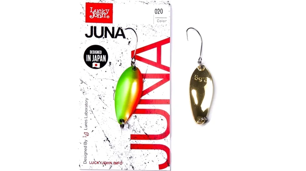 Уловиста форелева блешня Juna від торгової марки Lucky John найефективніше грає на повільній рівномірній проводці. Безбородий одинарник дозволяє застосовувати цю блешню для спортивного лову. "Колебалки" мають перевірену округлу опуклу форму, яка приваблює своїми рухами не тільки форель, але і окунів, головнів, невеликих щук. Довжина мініатюрної Juna 30 становить 3 см., а вага - 2,5 гр. Великий асортимент забарвлень дозволяє підібрати таку блешню, яка буде доречна в ваших умовах лову. Присутні двоколірні моделі, яскраві або темні приманки, моделі з блискітками.