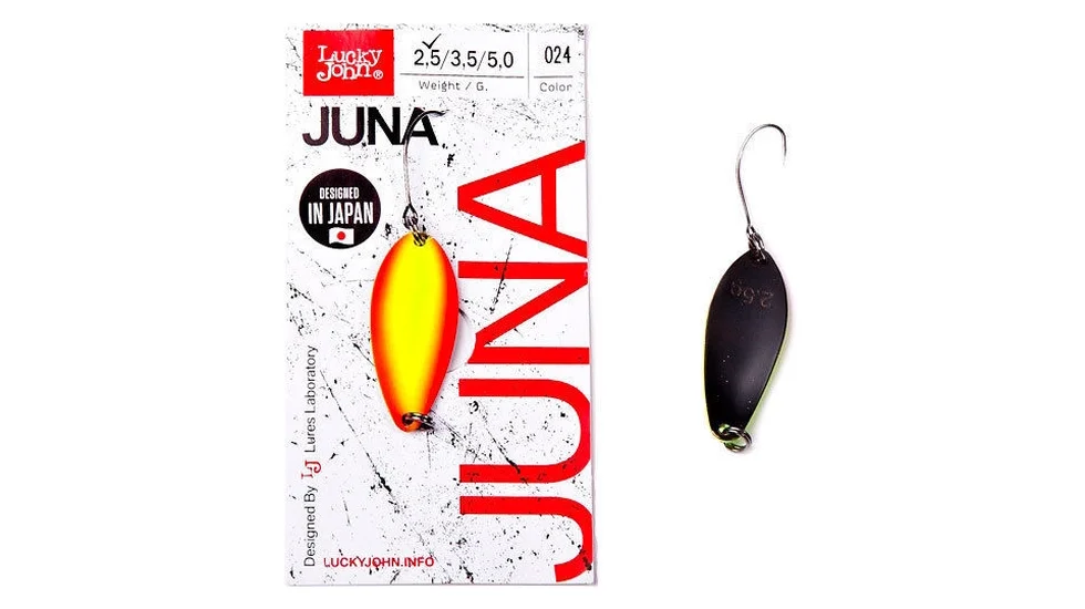 Уловиста форелева блешня Juna від торгової марки Lucky John найефективніше грає на повільній рівномірній проводці. Безбородий одинарник дозволяє застосовувати цю блешню для спортивного лову. "Колебалки" мають перевірену округлу опуклу форму, яка приваблює своїми рухами не тільки форель, але і окунів, головнів, невеликих щук. Довжина мініатюрної Juna 30 становить 3 см., а вага - 2,5 гр. Великий асортимент забарвлень дозволяє підібрати таку блешню, яка буде доречна в ваших умовах лову. Присутні двоколірні моделі, яскраві або темні приманки, моделі з блискітками.
