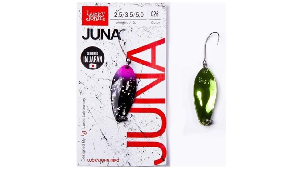 Уловиста форелева блешня Juna від торгової марки Lucky John найефективніше грає на повільній рівномірній проводці. Безбородий одинарник дозволяє застосовувати цю блешню для спортивного лову. "Колебалки" мають перевірену округлу опуклу форму, яка приваблює своїми рухами не тільки форель, але і окунів, головнів, невеликих щук. Довжина мініатюрної Juna 30 становить 3 см., а вага - 2,5 гр. Великий асортимент забарвлень дозволяє підібрати таку блешню, яка буде доречна в ваших умовах лову. Присутні двоколірні моделі, яскраві або темні приманки, моделі з блискітками.