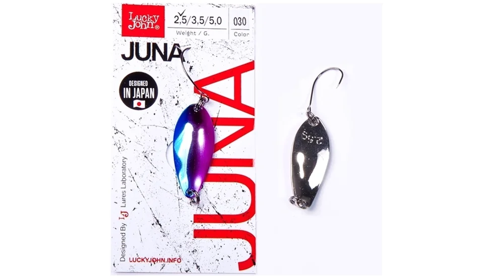 Уловиста форелева блешня Juna від торгової марки Lucky John найефективніше грає на повільній рівномірній проводці. Безбородий одинарник дозволяє застосовувати цю блешню для спортивного лову. "Колебалки" мають перевірену округлу опуклу форму, яка приваблює своїми рухами не тільки форель, але і окунів, головнів, невеликих щук. Довжина мініатюрної Juna 30 становить 3 см., а вага - 2,5 гр. Великий асортимент забарвлень дозволяє підібрати таку блешню, яка буде доречна в ваших умовах лову. Присутні двоколірні моделі, яскраві або темні приманки, моделі з блискітками.