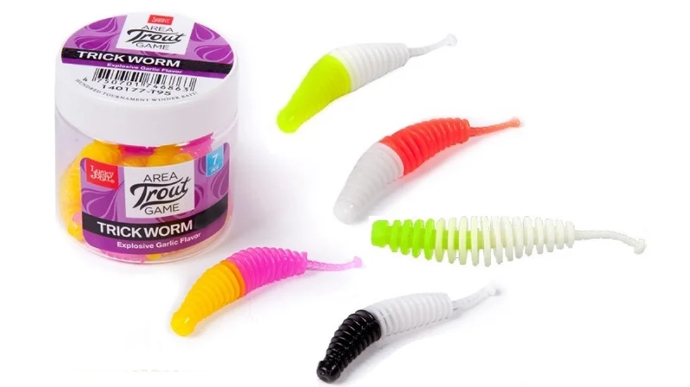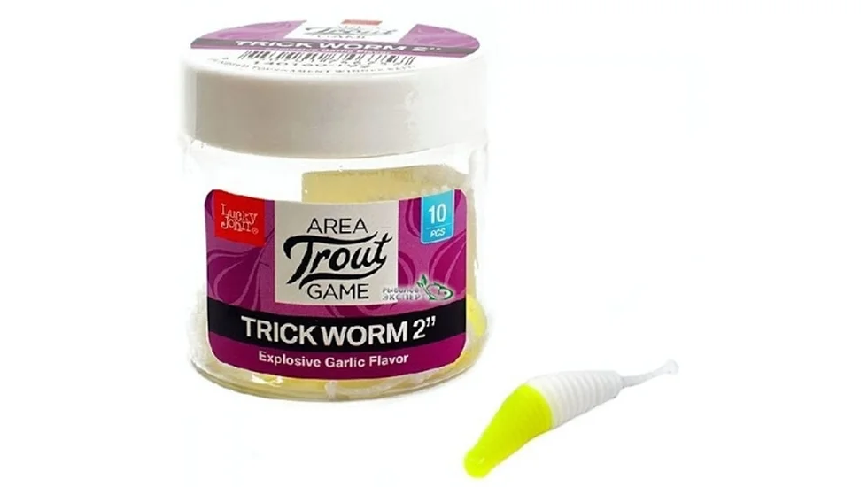 Trick Worm - "їстівна" силіконка, що входить в форелеву програму бренду Lucky John. Унікальність цієї приманки в тому, що використовувати її можна не тільки на прісних водоймах, а й для рокфішинга. Звичайно, виділяється Trick Worm і насиченим запахом часнику, яким її наділяє натуральний маслянистий атрактант. Слаг з об'ємним ребристим тілом підходить для таких оснасток, як "дроп-шот" або "джиг ріг", а також каролінського і техаського монтажу. Спокусливу силіконку від Lucky John можна використовувати не тільки для форелевої риболовлі - на неї буде добре клювати окунь. Принади упаковані в герметичну баночку із захисною мембраною.