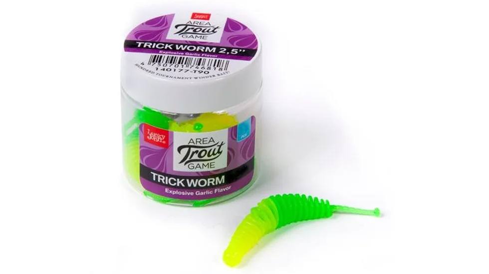Компанія Lucky John розробила нову програму для любителів лову ставкової форелі. Серія приманок Trick Worm входить в лінійку спеціалізованих форелевих приманок. Крім риболовлі на прісноводних ставках, ця модель може використовуватися для рокфішингового лову. Об'ємна приманка з ребристим тілом добре підходить для оснасток "дроп-шот", "джиг ріг", каролінських і техаських монтажів. Вона представлена в яскравих забарвленнях, традиційно використовуваних для форелевої риболовлі. Принади Trick Worm - "їстівні". Вони оброблені великою кількістю маслянистого атрактанта з насиченим запахом часнику. Принади упаковані в пластикові баночки з герметичною кришкою, які краще зберігають аромат атрактантів. У кожній банці - 10 шт.