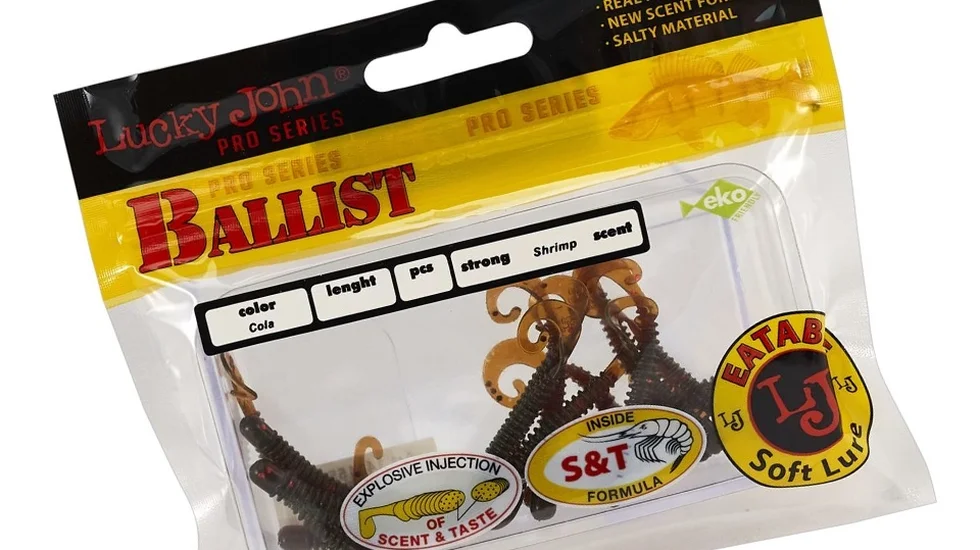 Витягнуте, вузьке, округле в перерізі тіло Ballist просякнуте ароматним атрактантом. Насичений запах креветки роздражнить навіть пасивних, млявих хижаків. Приманка має довжину 5 см і вагу 0,49 гр. Підійде для мікроджигового лову. Основна здобич - цікавий окунь, щучка і біла риба. Ребристе тіло Lucky John Ballist нагадує черв'яка або личинку. При проводці рифлення створює гідроакустичні мікровібрації. Маленький серповидний хвостик заманливо коливається. Модель добре працює на простій равномірці, коротких ривочках, сходинці і під час волочіння по дну. Віброхвіст можна оснащувати одинарним або офсетним гачком. Приманка підходить для оснащення джиг-голівкою, шарнірних і рознесених монтажів.