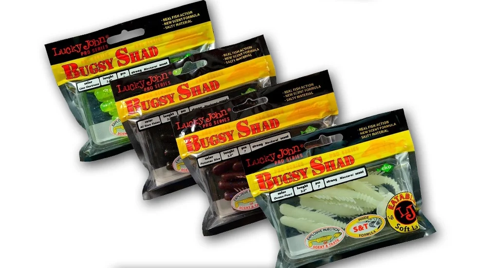 Кілька коротких відростків з кожного боку сплощеного тіла - особливість геометрії Bugsy Shad. Легкі коливання їх при проводці вносять "родзинку" в гру віброхвоста. Округла п'ята і кільцеві ребра біля основи хвостика відповідають за обурення середовища. На рівномірній, хвилеподібній, ступінчастій анімації плавні рухи приманки роблять її схожою на живу рибку. Для більшої схожості з кормовим об'єктом експерти Lucky John просочили Bugsy Shad атрактантом з ароматом макрелі. Природний запах приверне навіть обережну рибу. Довжина моделі 7,2 см, а маса 2,5 гр. Розробники рекомендують віброхвіст, в першу чергу, як мисливця за всюдисущим окунем і придонним мешканцем бершем. Для оснащення буде раціонально використовувати або великий одинарник, або офсетник. Працює модель і з класичною джиговою голівкою, на техаському монтажі. При обловлюванні порослих локацій добре застосовувати кулевидні грузила.