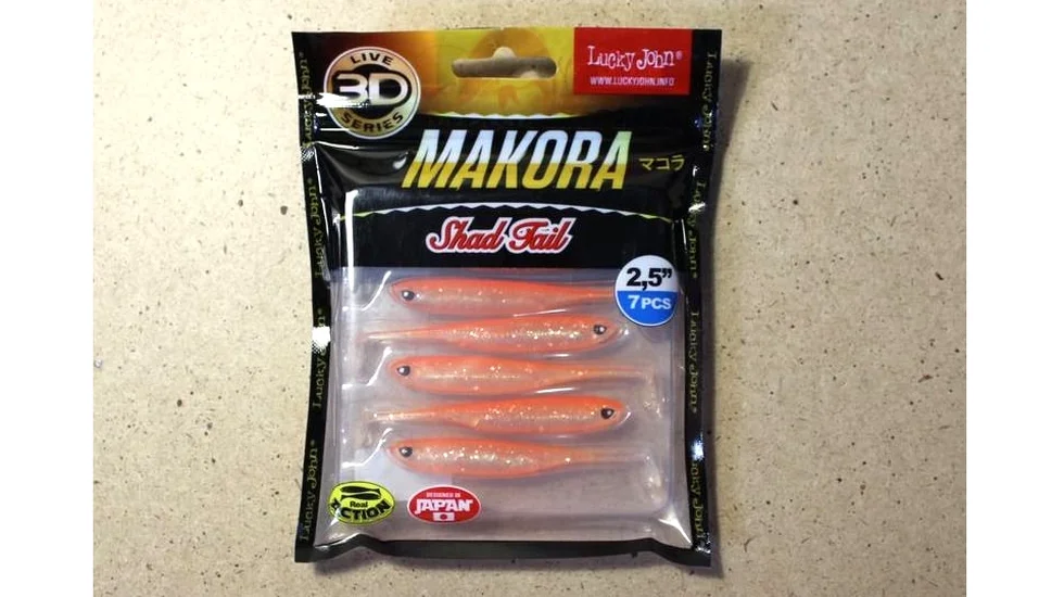 Блискуча довга трубочка, захована усередині тіла забезпечує для напівпрозорих моделей з сімейства Макора привабливі відблиски. Дана серія розроблена за 3д принципом і наділена дуже реалістичною, живою грою. Фігурне дрібне рифлення у моделі Shad Tail описує зябра, луску і інші деталі. Кругла велика п'ята на тоненькому витягнутому хвості відповідає за інтенсивні коливання. Габарити "силіконки" залучать популярну у спінінгістів зубасту щуку та середніх і більших розмірів всюдисущого окуня, а також берша або судака. Команда розробників Lucky John в першу чергу радять для Makora Shad Tail джиг-голівки з одинарником або двійником. Маса вантажу від 6 гр. У важкопрохідних локаціях можна застосовувати офсетник.