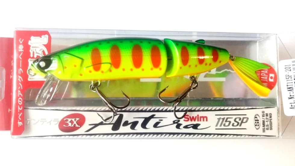 Воблери з сегментованою будовою володіють найбільш реалістичною грою, так як частини корпусу рухаються розкуто і природно. Модель Antira Swim F доповнена реалістичним хвостиком, що привертає увагу хижої риби. Гра приманки розкриється як на ривковій проводці невеликої інтенсивності, так і на равномірці. Робочий горизонт розташований на глибині 80 см. Цей воблер відмінно підходить для того, щоб обловлювати мілководні ділянки. Плавучість Antira Swim F позитивна. Під час паузи приманка піднімається вище горизонту проводки. Тому, щоб обійти зарості або перешкоду під водою, потрібно лише зупинити проводку. Довжина цієї приманки - 11,5 см при вазі в 14 гр. Цікавий яскравий дизайн не залишить воблер непоміченим в каламутній воді.