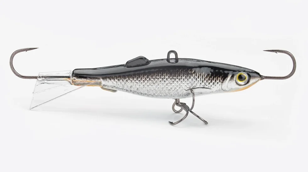 - Другий балансир у вигляді рибки, металевий з 1 гачком спереду, 1 гачком позаду та 1 потрійним гачком на підвісі посередині (колір: верх - чорно-сірий, низ - біло-рожевий, хвостовик пластиковий - безбарвний прозорий; довжина - 7,5 см, висота - 1 см, ширина - 0,9 см, вага 24 г) - 1 шт.;