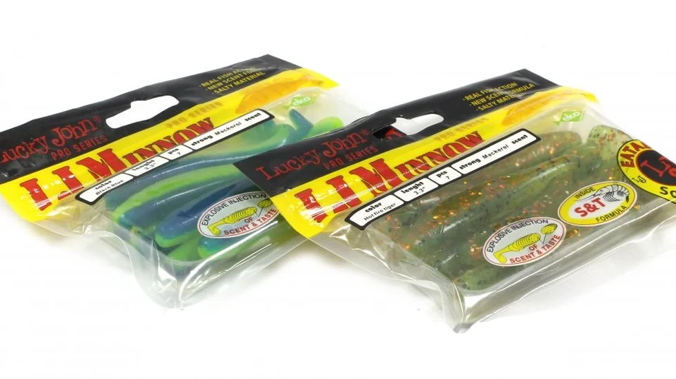 Підвищена м'якість і еластичність матеріалу при збереженні міцності - особливість моделі Minnow 56. В результаті віброхвіст отримав дуже пластичну живу гру. Широка п'ята з продуманою геометрією відповідає за потужні гідроакустичні вібрації при проводці. Для більшої привабливості експерти Lucky John доповнили склад матеріалу Minnow 56 ароматними солями, що наділило приманку смаковими якостями. Навіть після клювання риба не прагне випльовувати таке частування, що зручніше для підсічки. На поверхню тіла нанесено маслянистий атрактант з апетитним запахом. Довжина моделі 5,6 см, вага 1,55 гр. Серію можна назвати окуневою, але сподобається вона і бершу, щуці, судаку.