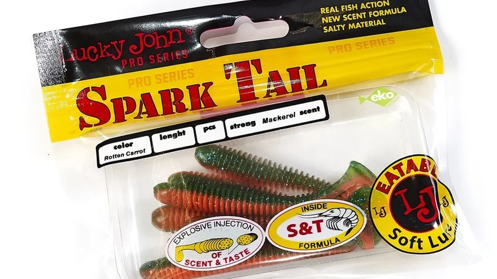 Віброхвіст з витягнутим тілом, покритим глибоким поперечним рифленням, і невеликим хвостиком з акуратною п'яточкою - це Spark Tail. Довжина даної моделі складає 10,1 см, а маса 4,32 гр. Коливання приманки добре привертають різних хижаків: судака, зубасту щуку і великих окунів. Модель виготовлена з їстівної гуми, тобто просякнута апетитними для риби атрактантами. Це змушує клюнувшу здобич довше утримувати частування в роті. Віброхвости від експертів Lucky John серії Spark Tail підходять для будь-яких монтажів. Завдяки м'ягкому, але міцному тілу, можуть використовуватися з подвійними, одинарними і офсетними гачками.