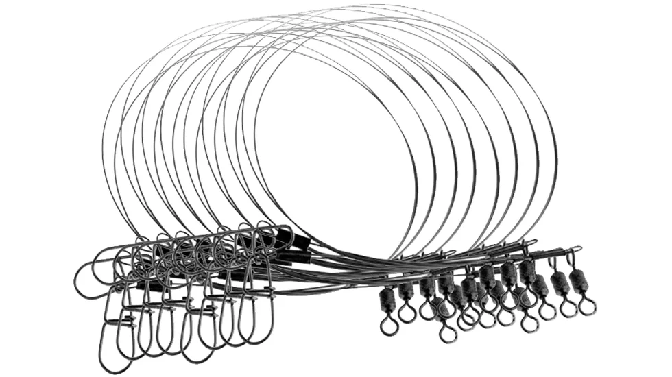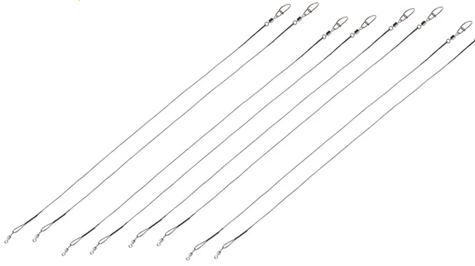 Набір повідків трьох розмірів. Надійні сталеві повідці для лову щуки. М'яке сталеве переплетіння з семи проводочків укладено зовні в нейлонову оболонку, а петлі повідця надійно зафіксовані синтетичною ниткою зі спеціальним просоченням. Повідці оснащені високоякісними вертлюгами (для з'єднання з основною жилкою) і вертлюгами з застібками (для кріплення приманки). Наявність двох вертлюг значно зменшує закручування волосіні. У наборі 3 розміри повідків: 15 см, 23 см, 30 см з тестом 6 кг. Кількість повідків в наборі - 72 штуки.
